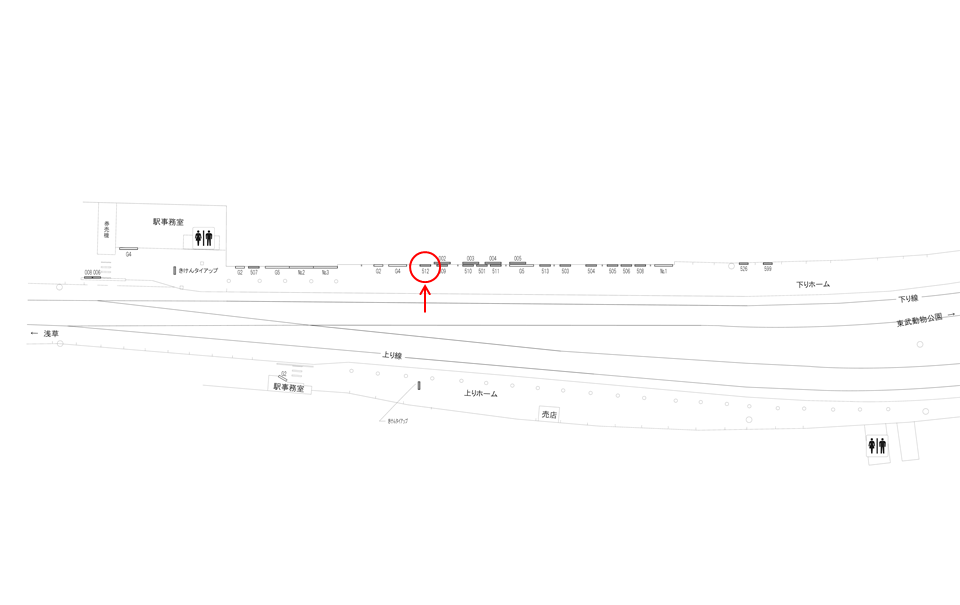 №512はホームの中でも中央付近にございます。線路を挟む形にはなりますが、向かいの曳舟・とうきょうスカイツリー・浅草方面ホームにいる方に正対する位置になります。