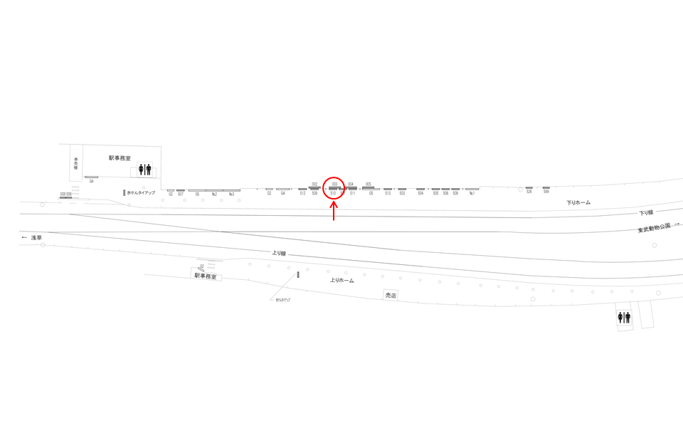 №003はホームの中でも中央付近にございます。線路を挟む形にはなりますが、向かいの曳舟・とうきょうスカイツリー・浅草方面ホームにいる方に正対する位置になります。