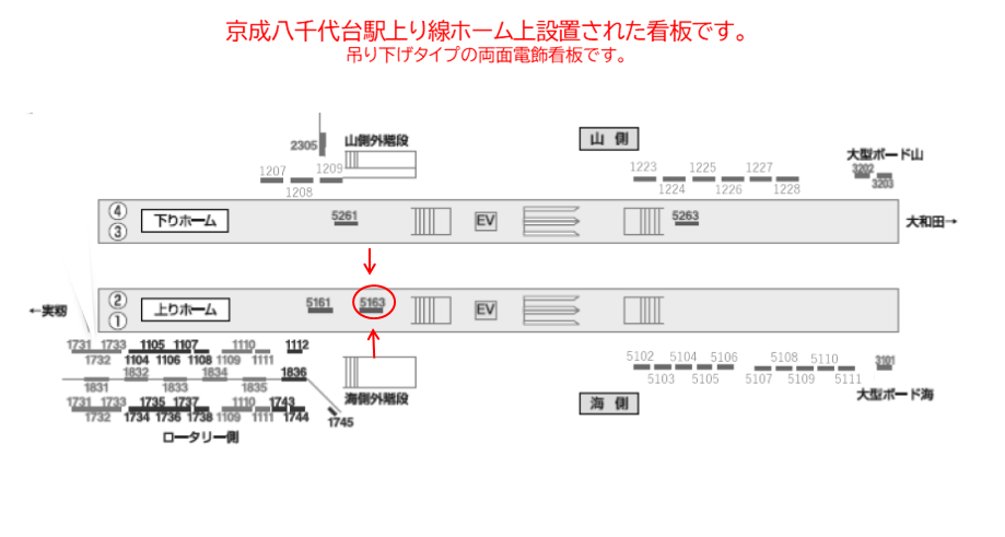 京成本線 八千代台駅の上りホーム(津田沼・船橋・上野方面行き)の看板です。上りホームで電車を待つ方が見る看板です。両面看板なので、反対側の下りホームからも視認可能です。