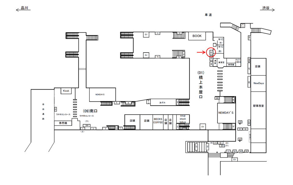 ○橋上本屋口№79 改札内コンコース(北改札口側 JR山手線ホーム 階段正面) |