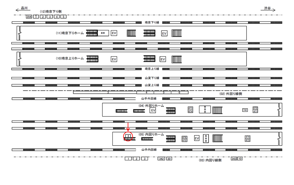 ○内回り線側№343 線路前(JR山手線内回り 品川・東京・上野方面) |