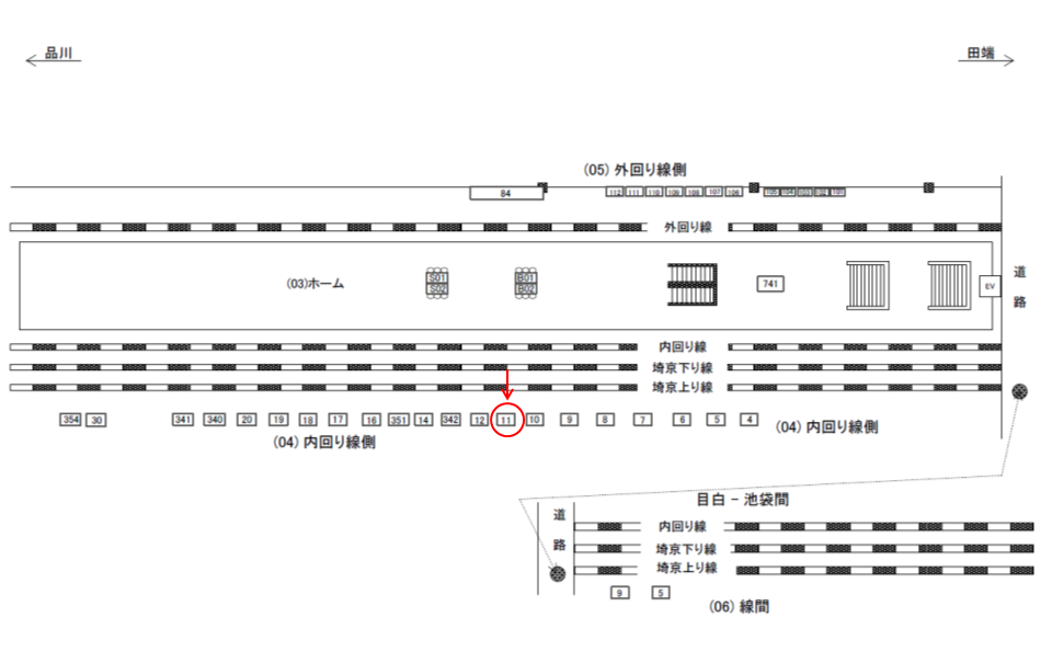 ○外回り線側№111 線路前(JR山手線外回り 池袋・上野・東京方面) |