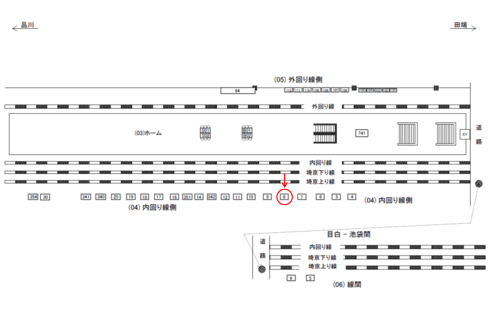 ○外回り線側№84 線路前(JR山手線 池袋・上野・東京方面) |
