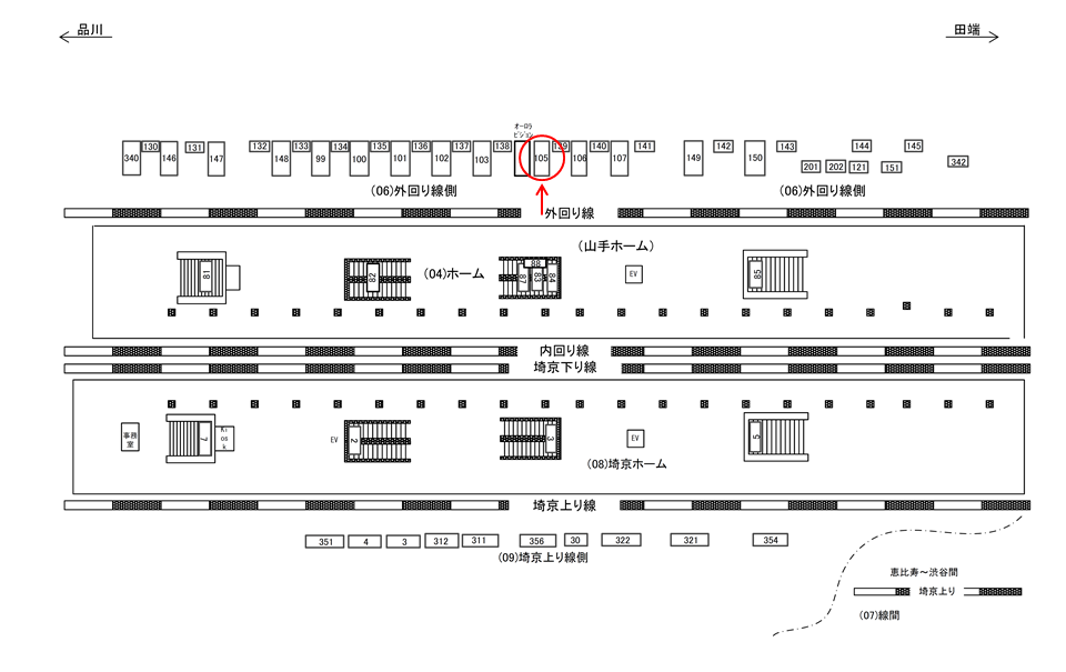 ○外回り線側№103 線路前(JR山手線外回り 渋谷・新宿・池袋方面) |