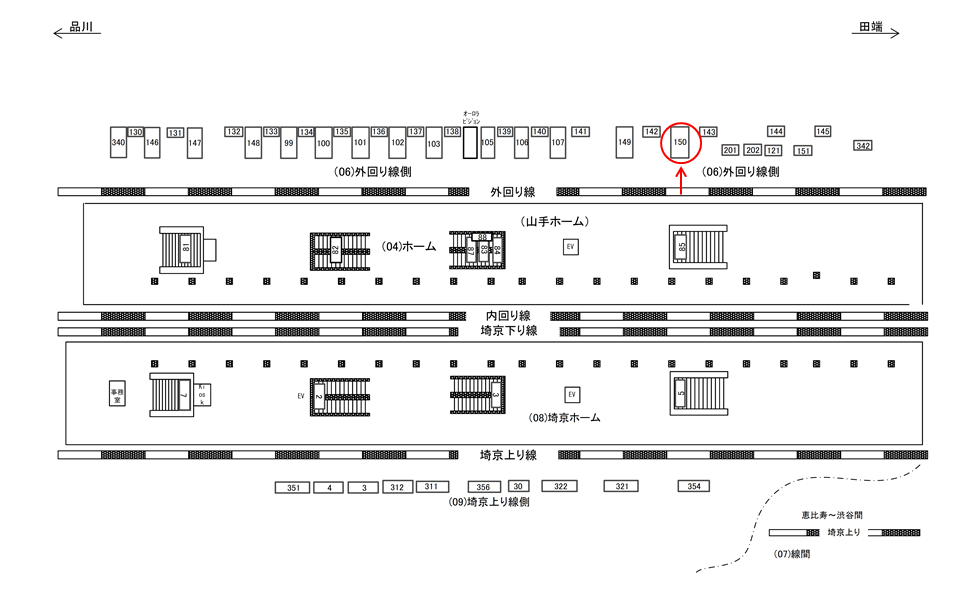 ○外回り線側№151 線路前(JR山手線外回り 渋谷・新宿・池袋方面) |