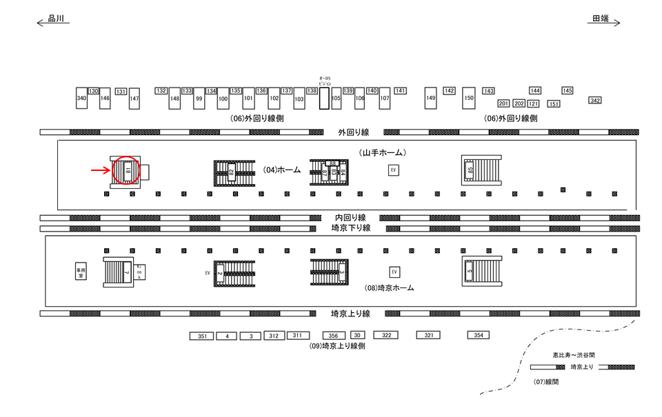 ○外回り線側№101 線路前(JR山手線外回り 渋谷・新宿・池袋方面) |
