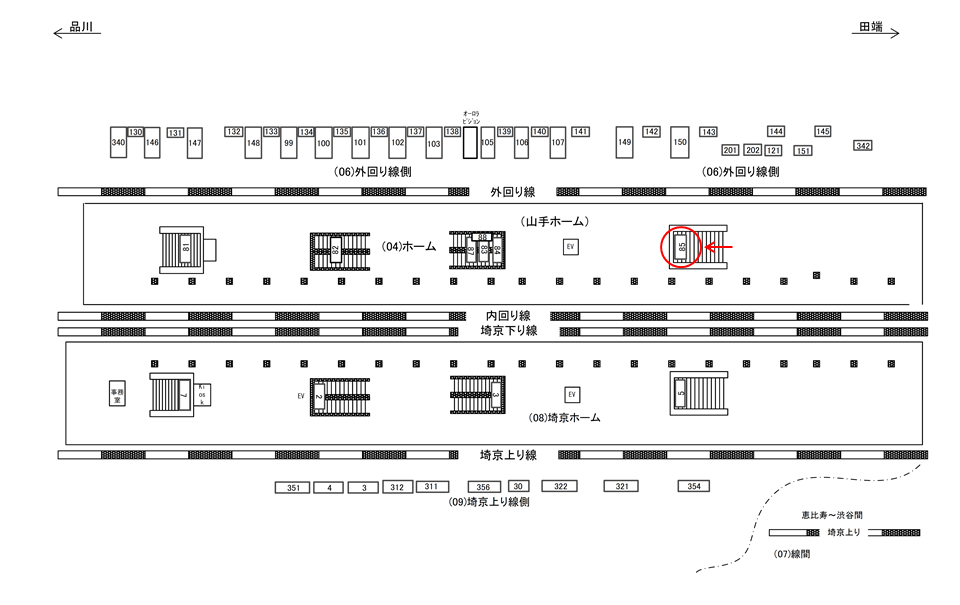 ○ホーム№81 ホーム上(階段正面 JR山手線ホーム 東口側改札寄り) |
