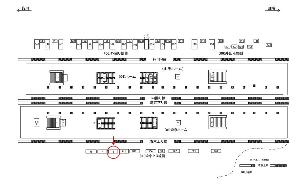 ○埼京上り線側№322 線路前(JR埼京線 大崎・りんかい線・相鉄線方面/JR湘南新宿ライン 横浜・大船・小田原・逗子方面) |