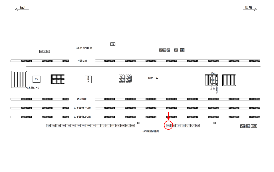 ホーム上(階段正面 JR山手線ホーム 東口側改札)