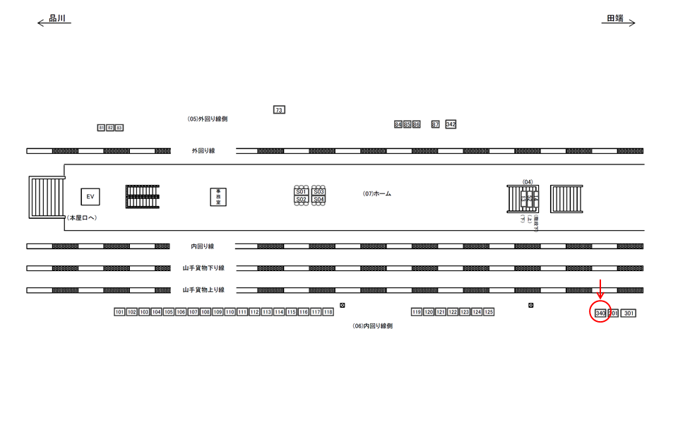 ○外回り線側№342 線路前(JR山手線外回り 田端・上野・東京方面) |