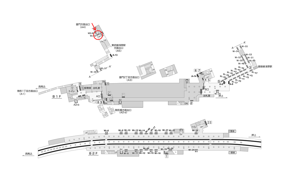 ○雷門方面改札側、A4(雷門 浅草寺や仲見世通り)出口方面に繋がる階段正面に設置