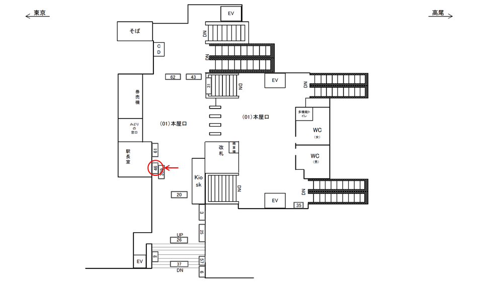 ○位置は北口出口方面。北口方面に向かう方の動線上、壁面に設置されています。