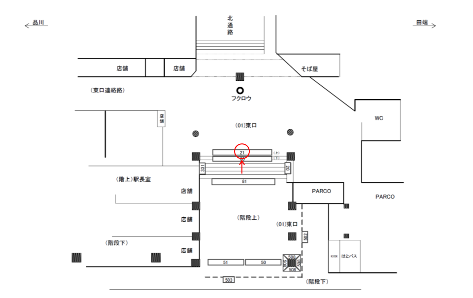 ○東口№20 改札外コンコース(階段横 北通路 東口方面) |