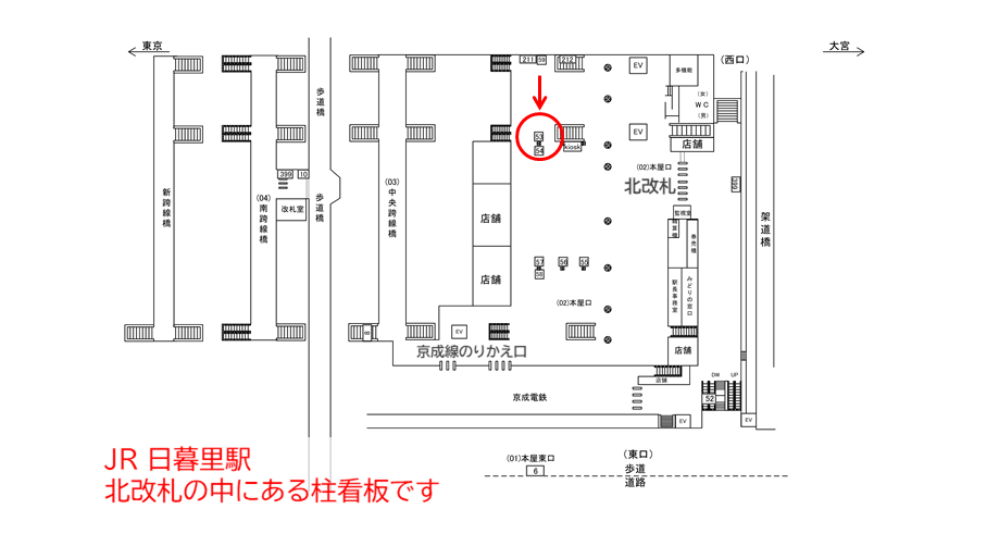 日暮里駅のメイン改札となる北改札の中にある柱看板です。山手線と京浜東北線が並走するホームから改札へ向かう導線上にあります。日暮里駅構内を通行する方を対象とした広告です。柱タイプの広告看板です。