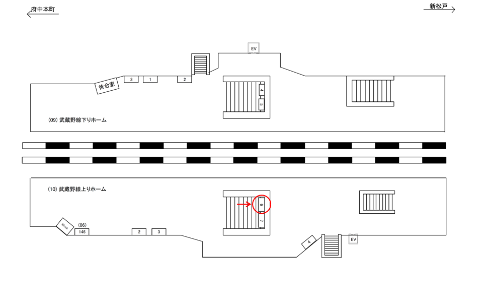 ○武蔵野線下りホーム№5 ホーム上(JR武蔵野線ホーム 階段正面) |