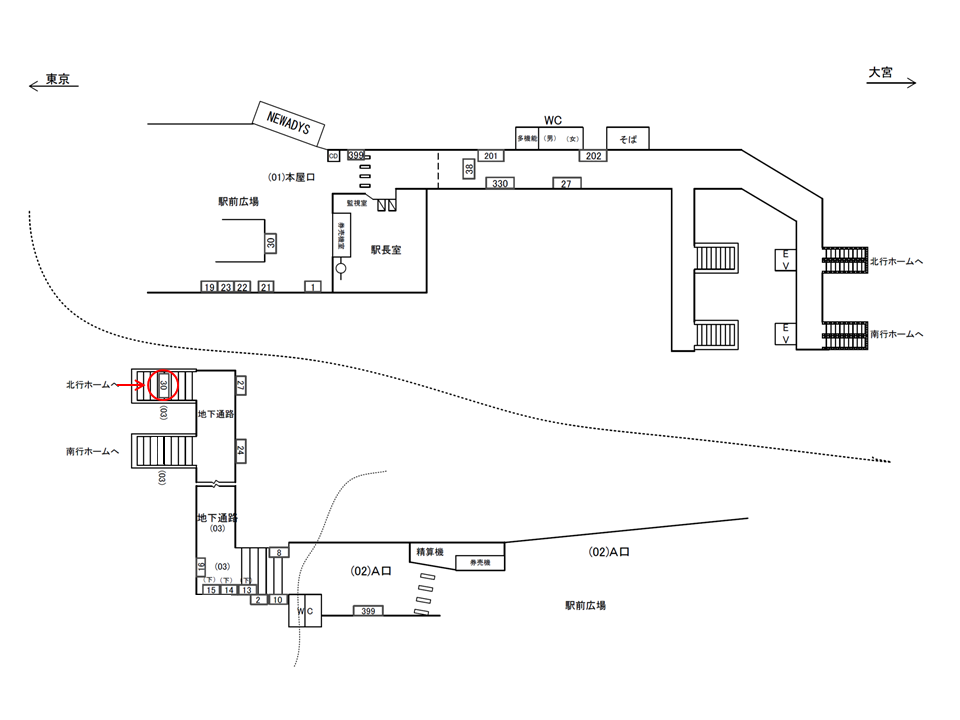 改札は北口と南口の2箇所、ホームは下層階に京浜東北線(大宮方面)山手線(内回り)ホームと京浜東北線(大船方面)山手線(外回り)ホームの計2面(島ホーム)ございます。山手線と京浜東北線はホームごとに同一方向に運行されており、同じホーム上にて乗り換えが行なえます。