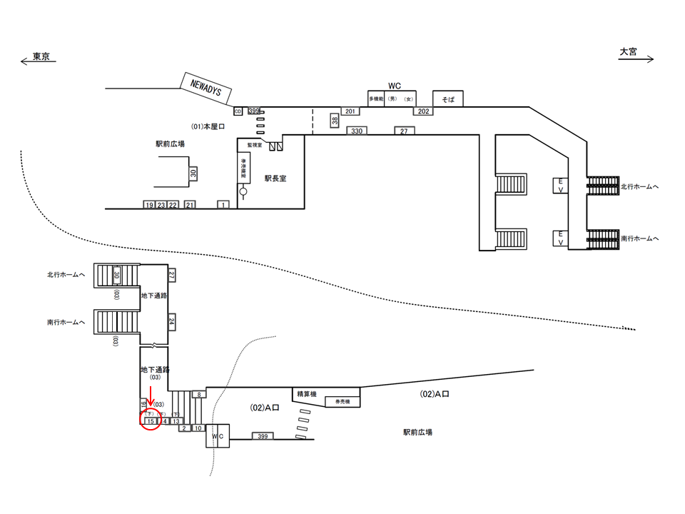 改札は北口と南口の2箇所、ホームは下層階に京浜東北線(大宮方面)山手線(内回り)ホームと京浜東北線(大船方面)山手線(外回り)ホームの計2面(島ホーム)ございます。山手線と京浜東北線はホームごとに同一方向に運行されており、同じホーム上にて乗り換えが行なえます。
