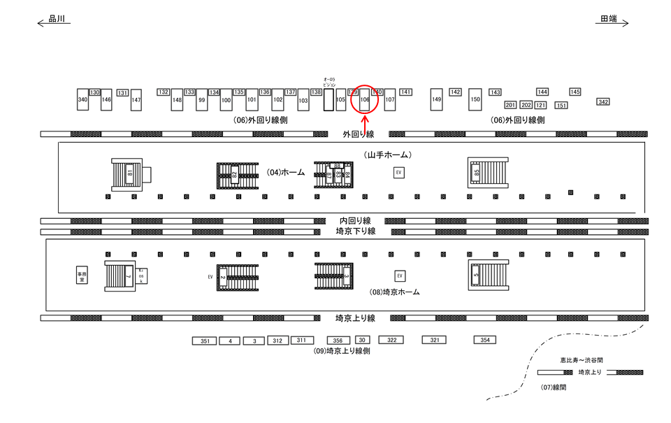 ○外回り線側№105 線路前(JR山手線外回り 渋谷・新宿・池袋方面) |
