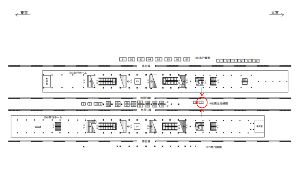 ○北行線側№91 線路前(JR京浜東北線 上野・大宮方面) |