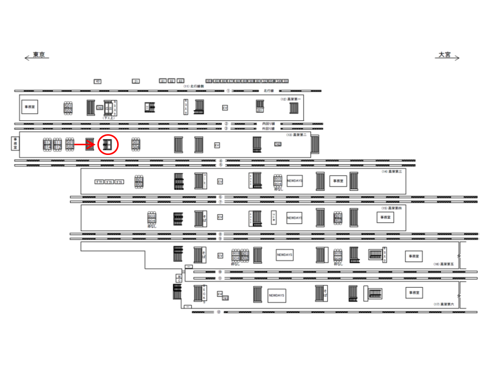 ○高架第一№12 ホーム上(階段正面 JR山手線内回り・JR京浜東北線北行ホーム) |