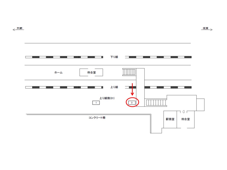 JR東金線 求名(ぐみょう)駅の上りホーム(大網・蘇我・千葉方面)に設置されている看板です。ホームで電車を待つ方が見る看板です。こちらの№3はホーム階段付近に設置されており、多くの方の目に止まる位置にございます。