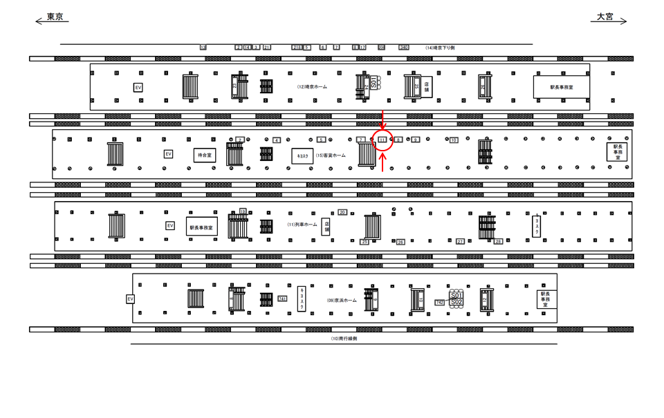 改札は北改札口と南改札口の地上2箇所、ホームは高架上層階に島ホーム4面(京浜東北線上下/宇都宮線・高崎線・上野東京ライン/宇都宮線・高崎線・湘南新宿ライン/埼京線の各ホーム)ございます。北口改札外は東西に抜けており、バス利用者や駅周辺を行き交う方々の自由通路としても機能しています。