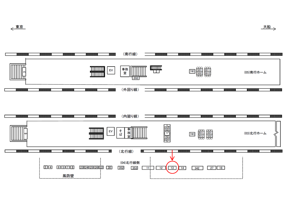 ○北行線側№352 線路前(JR京浜東北線 新橋・東京・上野・大宮方面) |