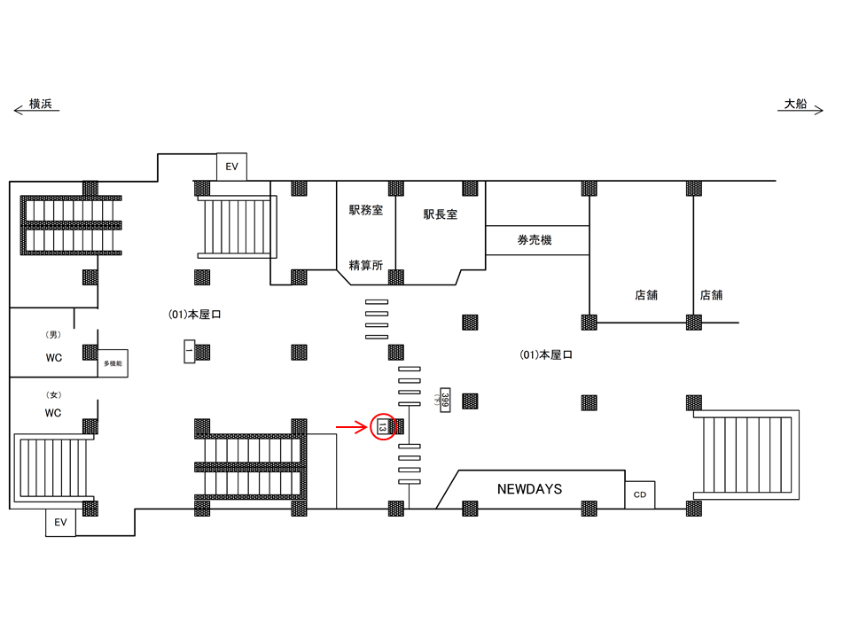 新杉田駅を出る際に正対する柱面にあります。移動する時に見せられる広告は駅周辺の店舗施設への誘導案内に適しています。