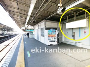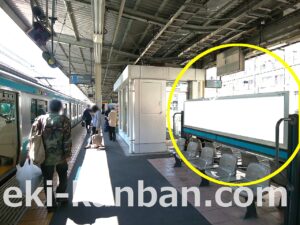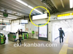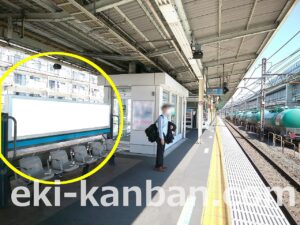 JR磯子駅の駅看板は、改札周辺とホームに看板設備があります。改札周辺はホームに下りる階段正面や西口出口付近に広告看板があります。ホームは上り線路前に建植タイプの広告看板、ホーム上にベンチタイプの広告看板があります。