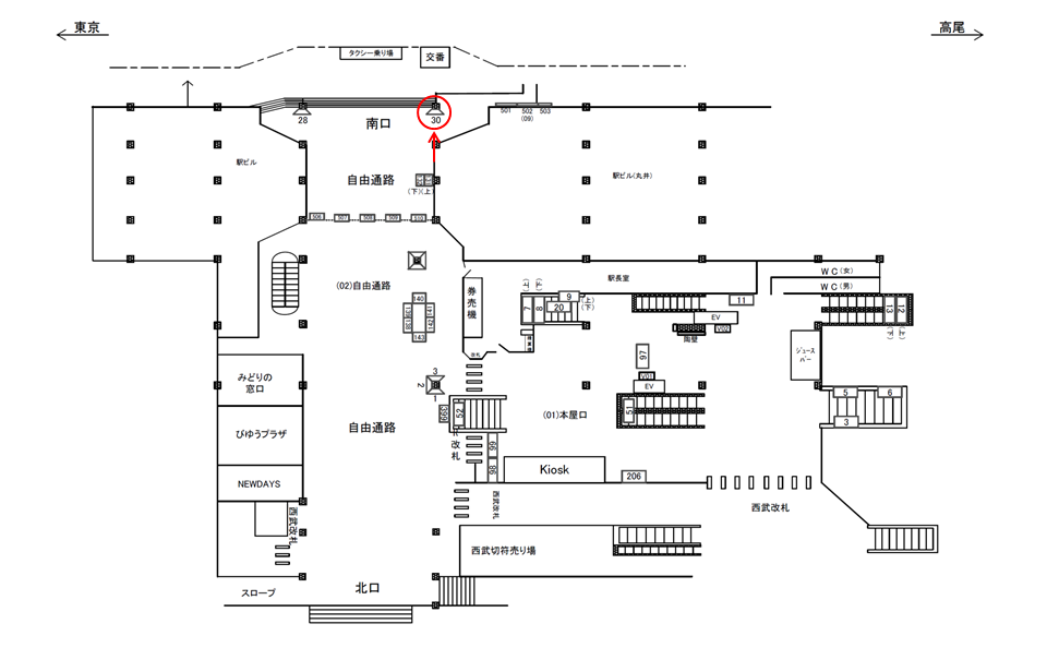 改札口は西武線との乗り換え改札を含め2箇所、出入り口は北口、南口の2箇所ございます。