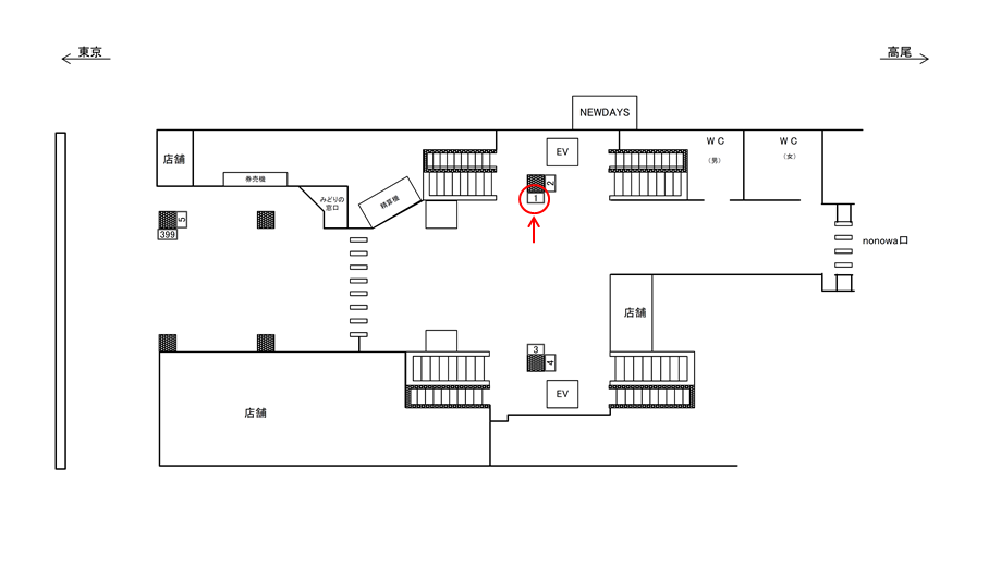 ○高架下りホーム№102 ホーム上(ホーム階段正面 中央快速線 立川・八王子・高尾方面ホーム) |
