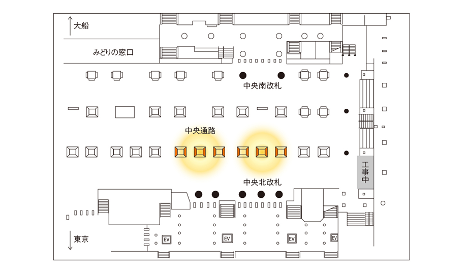 JR横浜駅「横浜中央通路ライトアップシート」は、横浜駅、中央通路の柱を使用する広告です。内照式の照明設備を備えており、往来される駅利用者の注目を集めます。