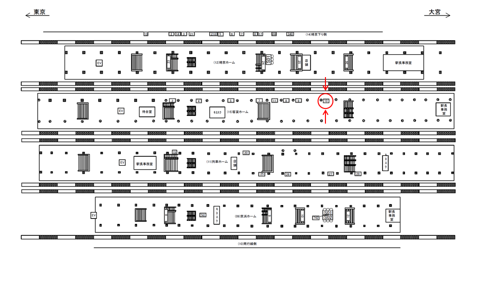 改札は北改札口と南改札口の地上2箇所、ホームは高架上層階に島ホーム4面(京浜東北線上下/宇都宮線・高崎線・上野東京ライン/宇都宮線・高崎線・湘南新宿ライン/埼京線の各ホーム)ございます。北口改札外は東西に抜けており、バス利用者や駅周辺を行き交う方々の自由通路としても機能しています。