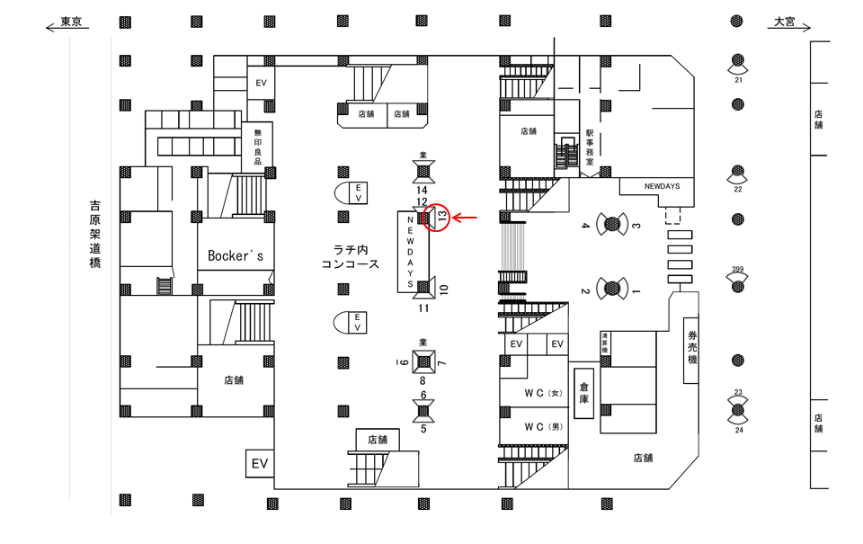 駅看板「JR 赤羽駅 南口コンコース№13」は南口改札を入った正面に位置する柱面にあります。駅構内を往来される方々にご覧頂けます。