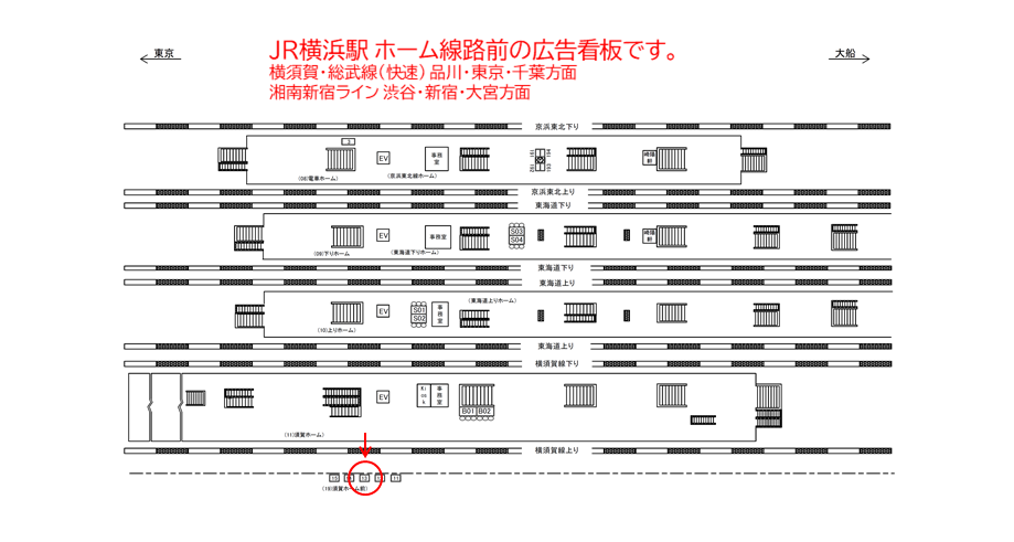 「JR 横浜駅 須賀ホーム前№13」は、横須賀総武線快速と湘南新宿ラインのホーム線路前にある電飾タイプの広告看板です。