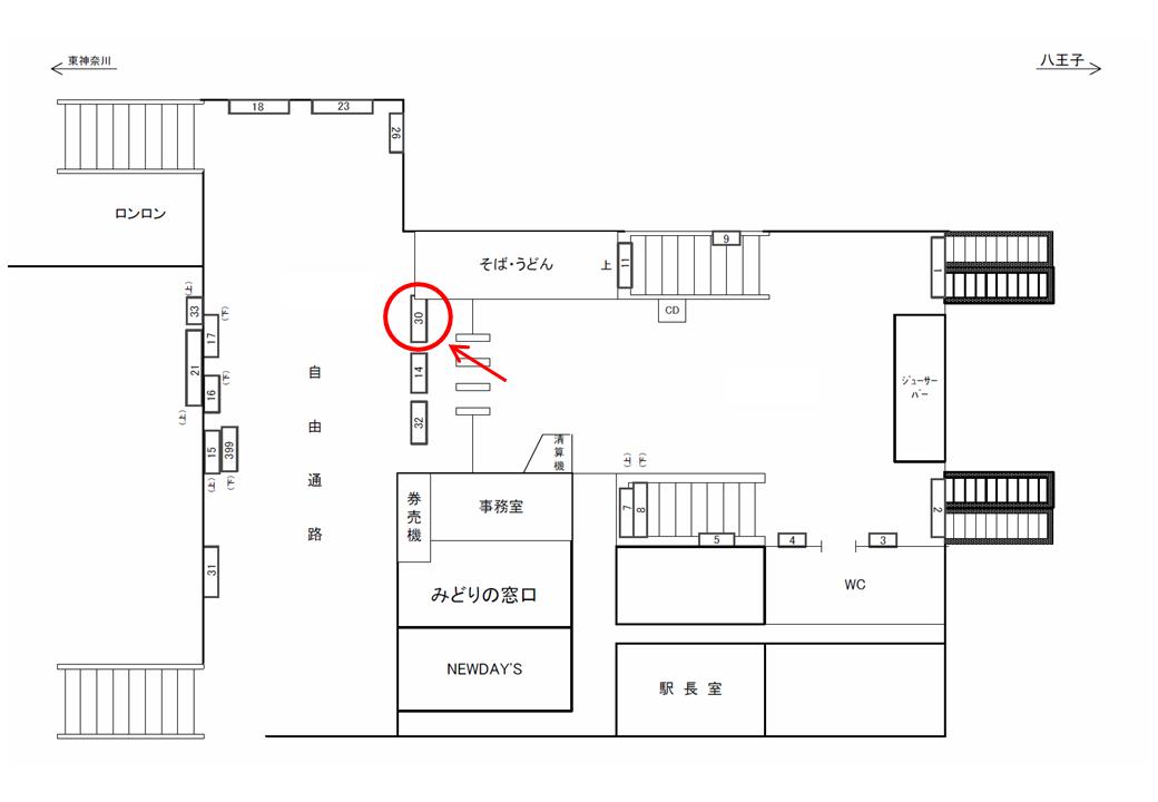 駅看板「JR 中山駅 本屋口№30」はJR中山駅の改札上部の看板に設置された電飾タイプの広告看板です。駅を出る際にご覧頂けますので、周辺店舗や施設へのご案内に適した看板です。