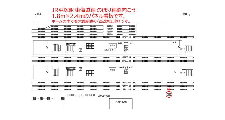 「JR 平塚駅 上り線側№65」は、線路前(JR 東海道線 横浜・品川・東京・上野方面)に設置された設置された駅看板(駅広告)です。※№65はホームのなかでも大磯駅寄り(西改札口寄り)にあります