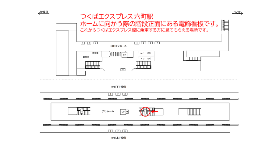 六町駅のホームは島ホーム1面です。上り方向(秋葉原行き)も下り方向(つくば行き)も同じホームから乗車します。ですので、この広告看板は両方向に向かう方を対象に広告できます。