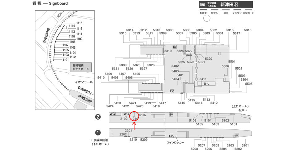 松戸線新津田沼駅、上りホーム(北習志野・松戸方面)の列車ホームに設置されている看板です。
