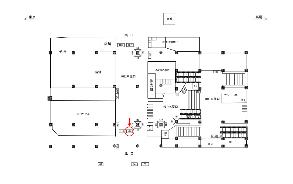改札を出場され、北口方面へ向かう際にご覧頂けるロケーションで、駅周辺にある店舗施設への誘導案内に適した広告看板です。