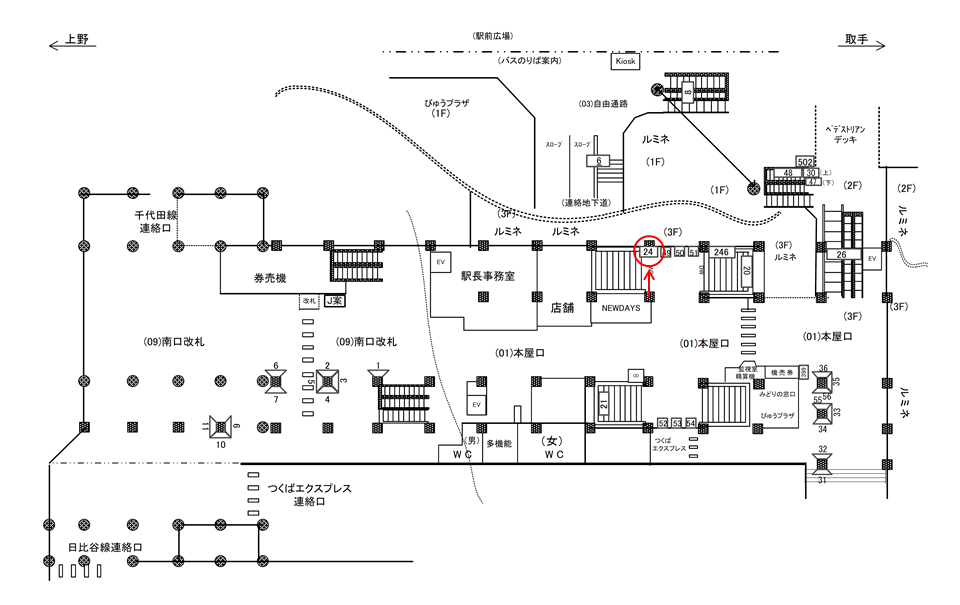 ・JR 常磐線(快速)・松戸・柏・成田・取手・土浦・水戸方面へ向かうお客様が多く利用される階段横にございます。