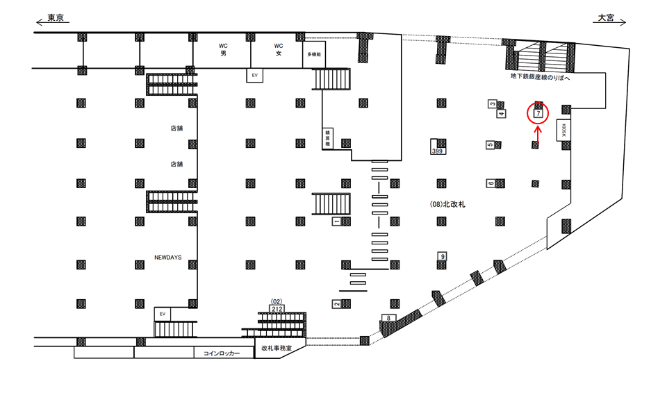 東京メトロ銀座線への乗り継ぎするための階段のそばです。神田駅を乗換の経由駅として利用される方を対象とした広告にも有用です。