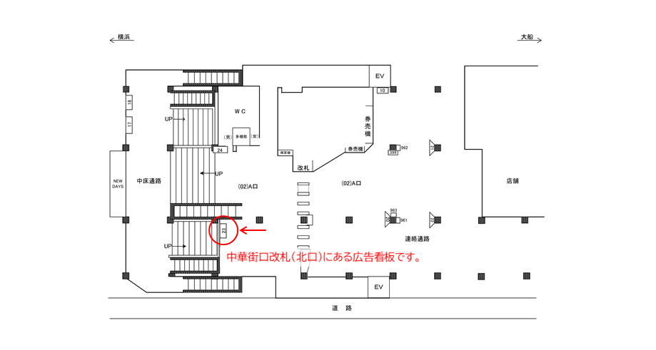 石川町駅の中華街口改札の中にあります。これから電車に乗車する方に見てもらえる向きです。(ホームへ向かう途中です!)