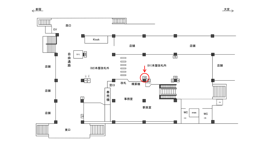 改札口は1箇所、出入り口は東口、西口の2箇所。