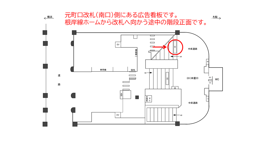 ホーム階段正面にある電飾看板です。横浜方面から石川町駅で下車された方が、元町口改札(南口)へ向かう途中にあります。これから駅を出る方を対象とした広告で、近隣商業施設の案内や、地元の方向けの企業認知に使えます。