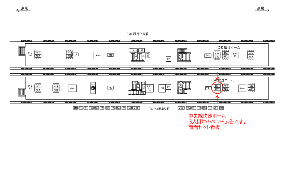 中央線快速ホームのベンチ背もたれ部分を使った広告です。快速線の上り側と下り側の両側に広告を掲載します。主にホームで電車を待つ方、ベンチを利用される方、に見てもらえる広告です。