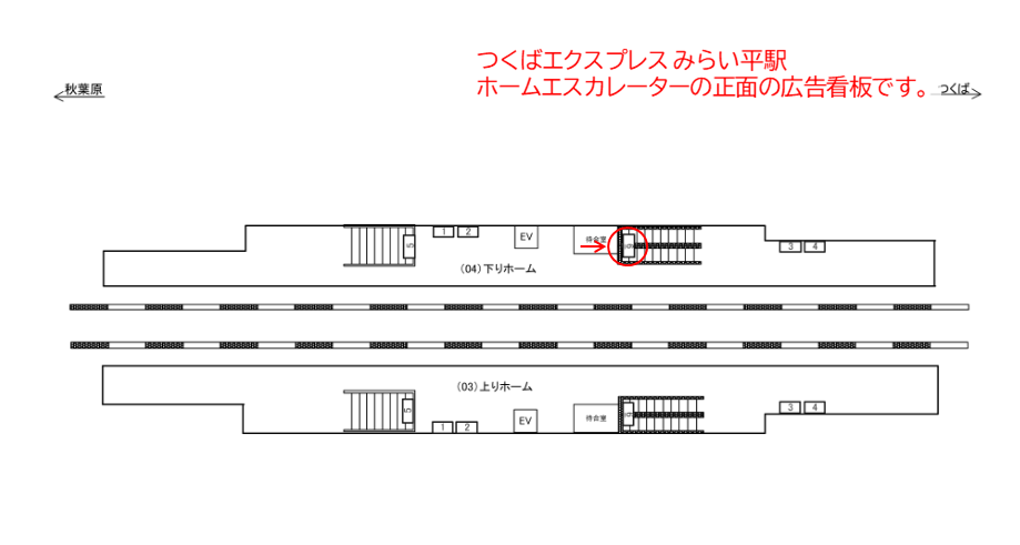 つくばエクスプレス みらい平駅のホームエスカ正面にある駅看板広告です。