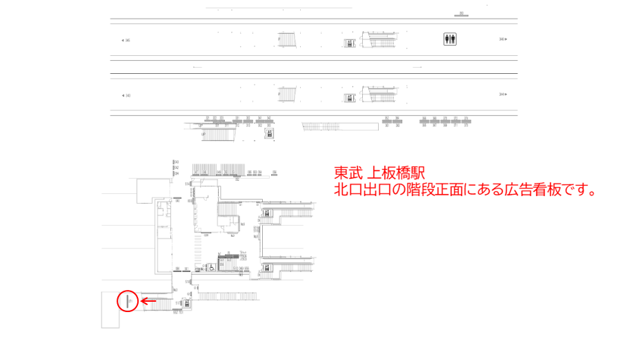 駅看板「東武 上板橋駅 №071」は北口出口の階段正面にある広告看板です。東武東上線を利用する方、上板橋駅の北口を出る方、に見てもらえます。