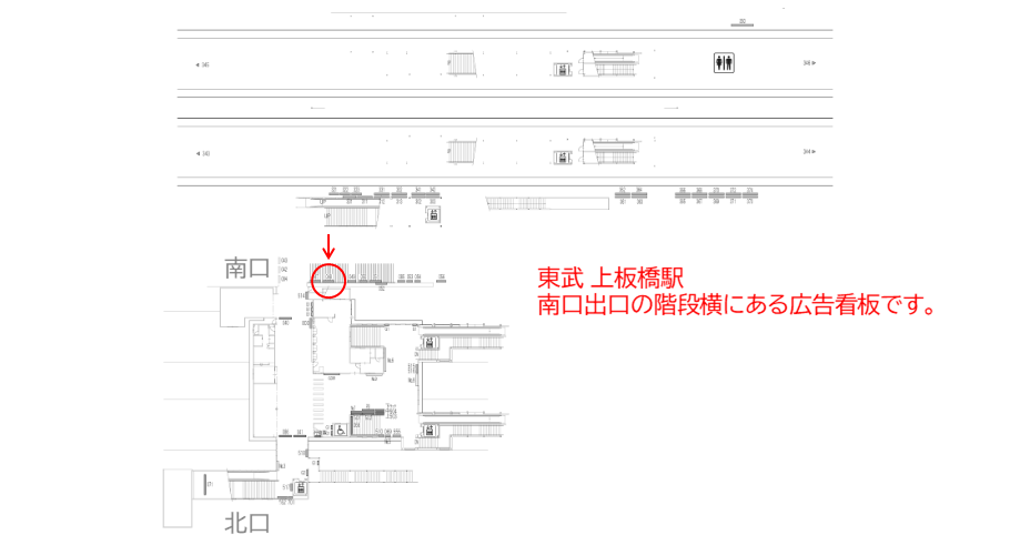駅看板「東武 上板橋駅 №048」は南口出口の階段横にある広告看板です。東武東上線を利用する方、上板橋駅の南北を行き来される方、に見てもらえます。