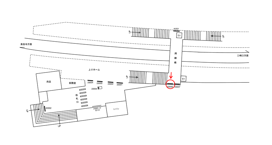 駅看板「京急 北久里浜駅 №23008」は品川・横浜方面から北久里浜駅で下車された方が改札へ向かう際、こ線橋の正面に見える位置にあります。